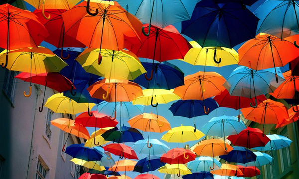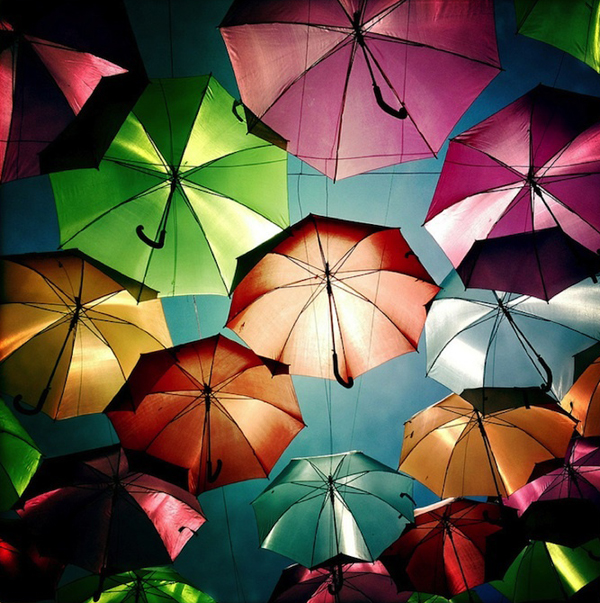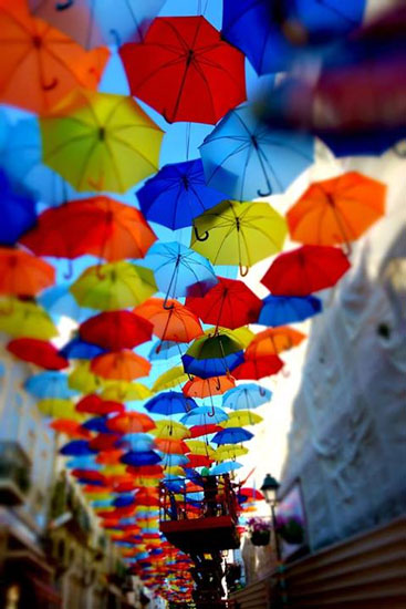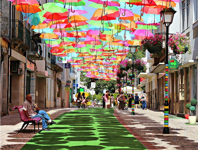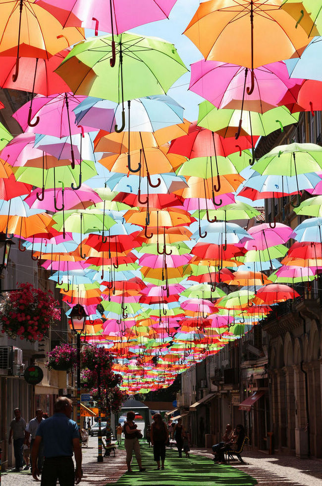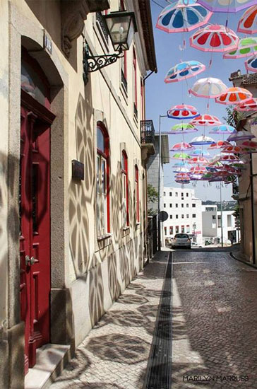 其实这一条由雨伞装饰的街道,是由葡萄牙波尔图市南部的的一个小城的管委会提议所设置的,为今年“摇曳的阿格达”(Agitagueda)艺术节的一部分展览。这条名为“漂浮雨伞街”街道上方的电线上悬挂了大量色彩缤纷的漂亮雨伞,它们看起来就好像漂浮在半空中一样,创造出了一个奇妙的色彩空间。